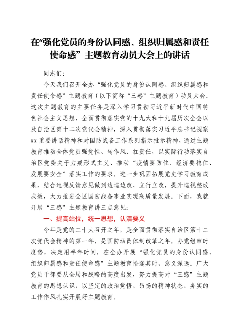 在“强化党员的身份认同感、组织归属感和责任使命感”主题教育动员大会上的讲话.docx