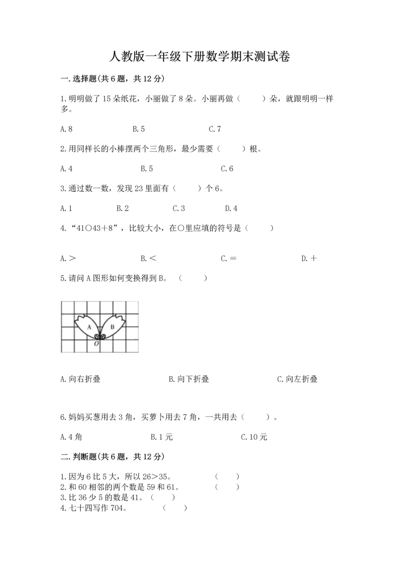 人教版一年级下册数学期末测试卷(研优卷).docx