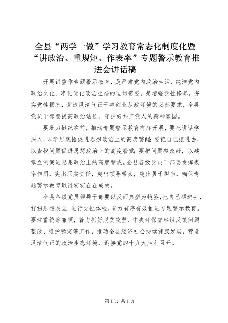 全县“两学一做”学习教育常态化制度化暨“讲政治、重规矩、作表率”专题警示教育推进会致辞稿.docx