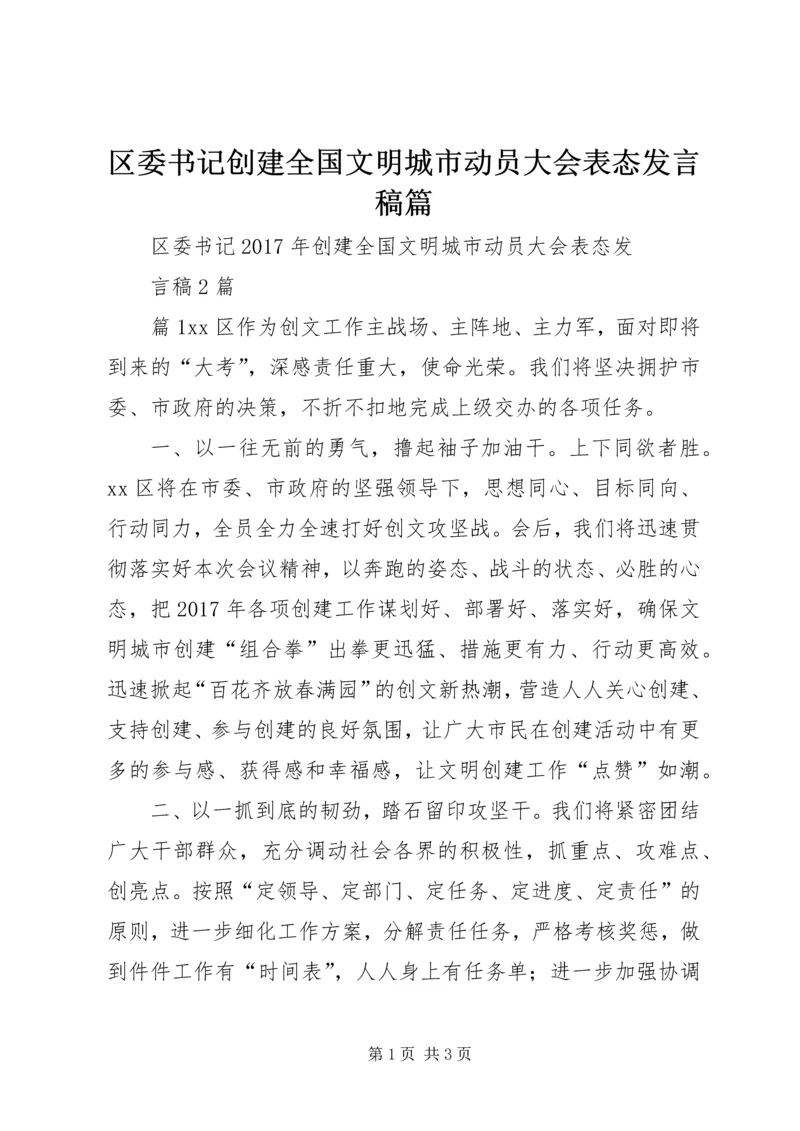 区委书记创建全国文明城市动员大会表态发言稿篇.docx